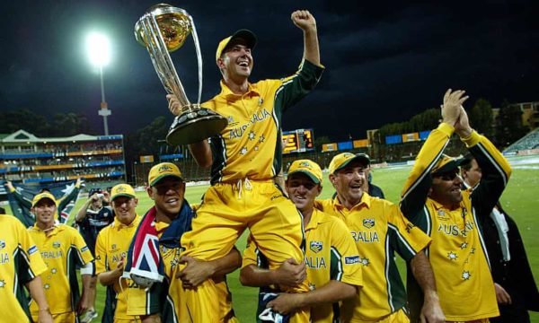 Ricky Ponting is carried on the shoulders of his teammates with the World Cup after their victory against India in the 2003 final in Johannesburg. Photograph: Jon Hrusa/AP
