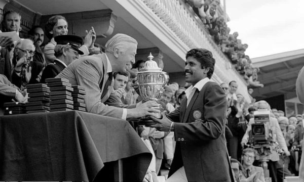 Kapil Dev receives the World Cup after India’s triumph at Lord’s in 1983, having come into the tournament as 40-1 outsiders. Photograph: Patrick Eagar/Patrick Eagar via Getty Images