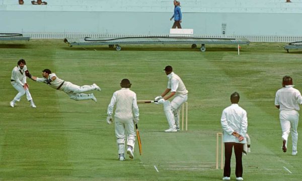 Rod Marsh dives in front of first slip to dismiss Tony Greig during the World Cup match between Australian and England at Headingley in 1975. Photograph: Patrick Eagar via Getty Images
