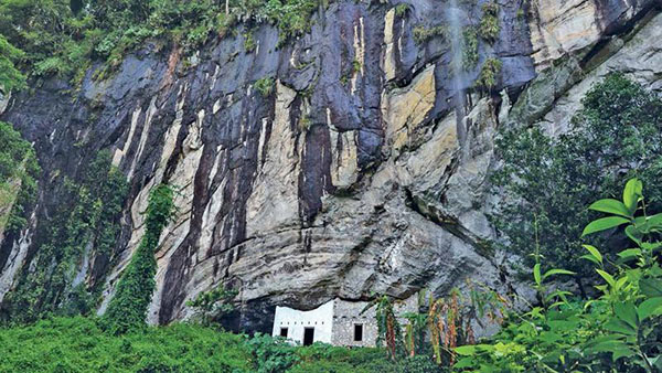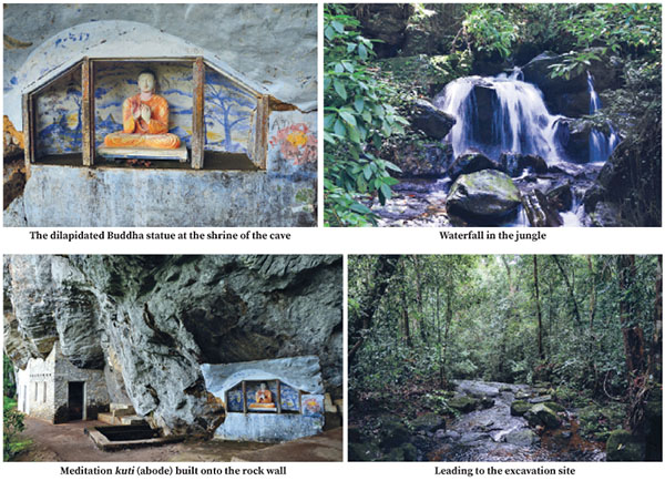 The Batadomba-lena cave is nestled in a tropical rainforest on a summit in the thick forest at Waladura, Kuruwita, in Ratnapura. This place can be reached by travelling two kilometres along the Eratna road which is linked to the Colombo-Ratnapura main (A4) road at the Kuruwita town and proceeding a further distance of 4.5 kilometres along the Guruluwana road. The Archaeology Department’s iconic sign board in the centre of the Kuruwita town shows visitors the way to the historic cave. The road leading to the cave is one kilometer away and the summit has to be reached by foot.