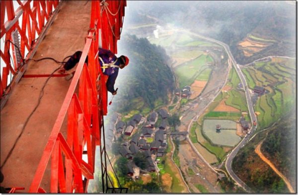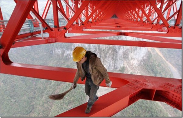 Note that the person below is 1,102 feet above the ground and is sweeping the dirt off this twenty first century Engineering marvel with a broom that was designed centuries ago and has no safety line.