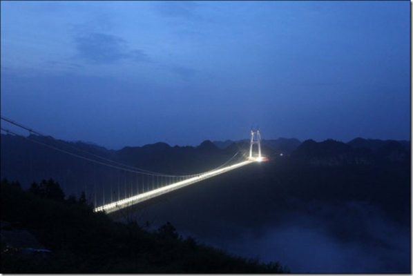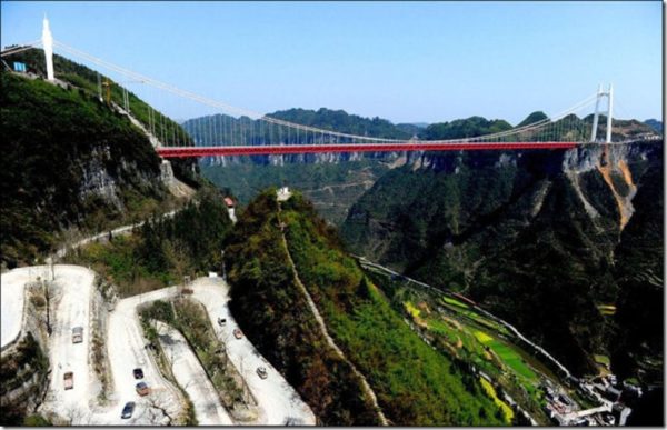 China has opened the record-breaking 4,000 ft. long bridge. Aizhai Bridge in Hunan province is 336 m (1,102 ft.) high and has a 1,176 m (3,858 ft.) span. It connects two traffic tunnels in the mountains, cutting the time needed to traverse the canyon from 30 minutes to 1 minute.