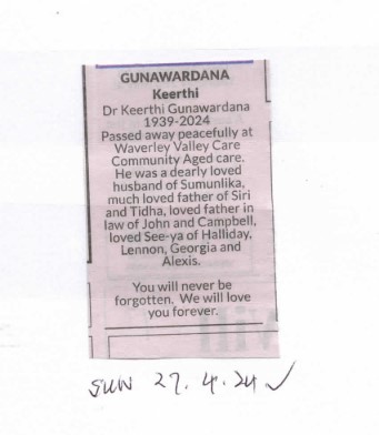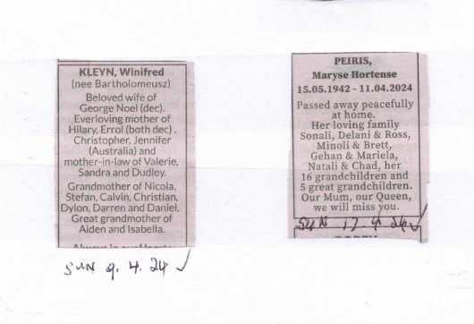 Obituaries CLASSIFIED NOTICES – APRIL 2024 Last updated: May 2, 2024 4:12 pm By eLanka adminByeLanka admin Share 0 Min Read SHARE CLASSIFIED NOTICES – APRIL 2024 Click here to receive your free copy of the eLanka Newsletter twice a week delivered directly to your inbox! TAGGED:CLASSIFIED NOTICES - APRIL 2024 Share This Article Email Copy Link Print Previous Article Remembering Heroes on 30th Anniversary of Special Boat Squadron Next Article Sri Lanka continue unbeaten streak, Netherlands push for top spot in Group B FacebookLikeYoutubeSubscribeLinkedInFollow Most Read “A PICTURE SPEAKS A 1000 WORDS” – By Des Kelly “TREES OF SRI LANKA” – By Des Kelly A Life Hack for when we’re Burnt Out & Broken Down – By Uma Panch Narration of the History of our Proud Ancestral (Orang Jawa) Heritage. by Noor R. Rahim eLanka Marriage Proposals Noel News Noel News- By Noel Whittaker EILEEN MARY SIBELLE DE SILVA (nee DISSANAYAKE) – 29 September 1922 – 6 April 2018 – A Woman of Value an Appreciation written by Mohini Gunasekera K.K.S. Cement Factory Dr.Harold Gunatillake’s 90th Birthday party - Advertisement -