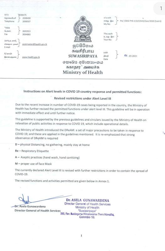 Meanwhile, wedding functions will not be permitted to held until May 20. This will be reviewed after that particular period based on the prevailing COVID-19 situation in the country. This will come to effect from May 4, the Ministry said.