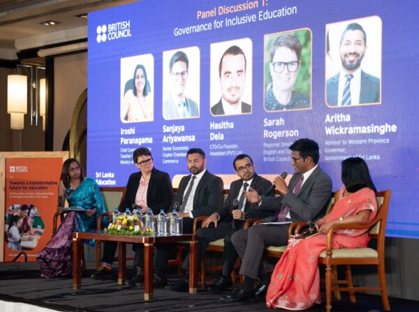 British Council 4 – British Council Sri Lanka Head of English and School Education Anju Moses, British Council South Asia Director of English and School Education Sarah Rogerson, Government of Sri Lanka Advisor to Western Province Governor Aritha Wickramasinghe, Headstart (PVT) Ltd CTO/Co-Founder Hasitha Dela, Ceylon Chamber of Commerce Senior Economist Sanjaya Ariyawansa and Minister of Education Teacher Education Chief Commissioner Iroshi Paranagama