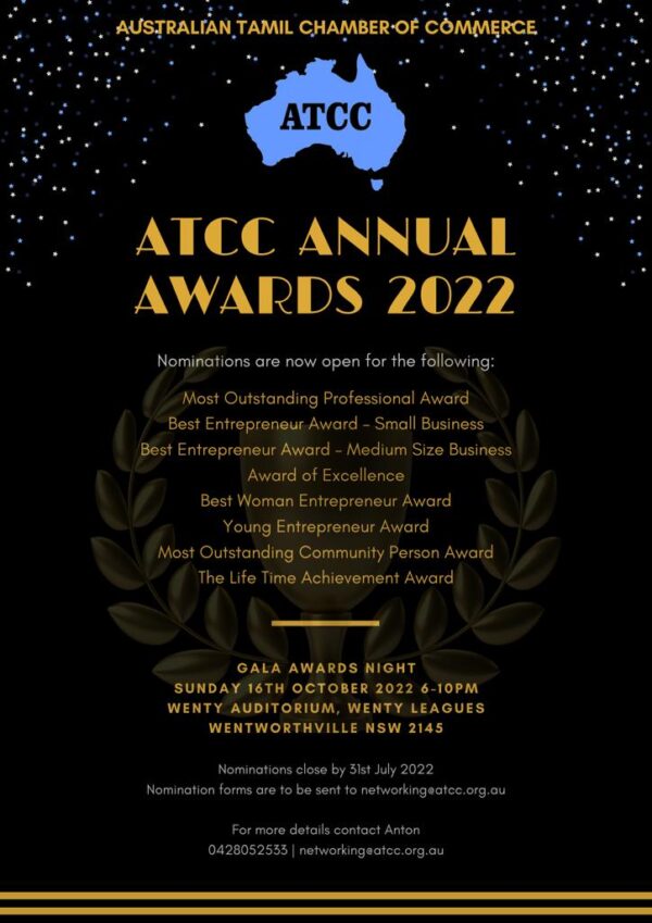 The Australian Tamil Chamber of Commerce Inc. is proud to present “ATCC Annual Awards 2022” on Sunday 16th October 2022, from 6:00 pm to 11:00 pm at Wenty Auditorium, Wenty Leagues, NSW 2145.