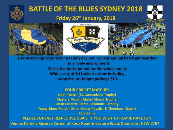 Battle of the Blues Sydney 2018 Last updated: January 12, 2018 8:19 am By admin Share 0 Min Read SHARE Battle of the Blues Sydney 2018 Share This Article Email Copy Link Print Previous Article 10th Anniversary Big Bash Next Article Music for a Sunday Leave a Comment Leave a ReplyYou must be logged in to post a comment. FacebookLikeYoutubeSubscribeLinkedInFollow Most Read “A PICTURE SPEAKS A 1000 WORDS” – By Des Kelly “TREES OF SRI LANKA” – By Des Kelly A Life Hack for when we’re Burnt Out & Broken Down – By Uma Panch Narration of the History of our Proud Ancestral (Orang Jawa) Heritage. by Noor R. Rahim eLanka Marriage Proposals Noel News Noel News- By Noel Whittaker EILEEN MARY SIBELLE DE SILVA (nee DISSANAYAKE) – 29 September 1922 – 6 April 2018 – A Woman of Value an Appreciation written by Mohini Gunasekera K.K.S. Cement Factory Dr.Harold Gunatillake’s 90th Birthday party - Advertisement -