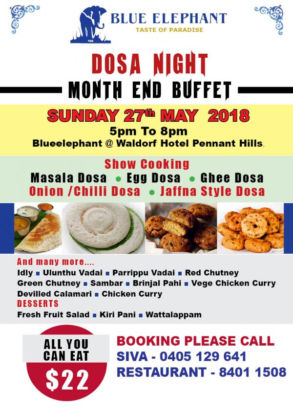 Dosa Night – Month End Buffet – @ the Blue Elephant (Sunday 27th May 2018) – Sydney Event Last updated: May 14, 2018 12:19 pm By eLanka adminByeLanka admin Share 0 Min Read SHARE Dosa Night – Month End Buffet – @ the Blue Elephant (Sunday 27th May 2018) – Sydney Event Share This Article Email Copy Link Print Previous Article A Night of Compassion – by the Sri lankan Association of NSW INC ( 7th July 2018 Sydney Event) Next Article AFTERNOON TEA PARTY Leave a Comment Leave a ReplyYou must be logged in to post a comment. FacebookLikeYoutubeSubscribeLinkedInFollow Most Read “A PICTURE SPEAKS A 1000 WORDS” – By Des Kelly “TREES OF SRI LANKA” – By Des Kelly A Life Hack for when we’re Burnt Out & Broken Down – By Uma Panch Narration of the History of our Proud Ancestral (Orang Jawa) Heritage. by Noor R. Rahim eLanka Marriage Proposals Noel News Noel News- By Noel Whittaker EILEEN MARY SIBELLE DE SILVA (nee DISSANAYAKE) – 29 September 1922 – 6 April 2018 – A Woman of Value an Appreciation written by Mohini Gunasekera K.K.S. Cement Factory Dr.Harold Gunatillake’s 90th Birthday party - Advertisement -