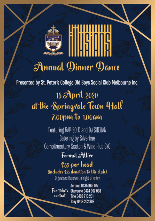 Illusions – Presented by St. Peter’s College Old Boys Social Club Melbourne Inc – Annual Dinner Dance Last updated: December 19, 2019 3:56 pm By eLanka adminByeLanka admin Share 0 Min Read SHARE Illusions – Presented by St. Peter’s College Old Boys Social Club Melbourne Inc – Annual Dinner Dance 18 April 2020 At the Springvale town Hall 7.00pm to 1.00 am More Read SPC Golf Open 2025 – SUNDAY, 18TH MAY 2025 – 11.15 AM ( sydney Event ) ST PETER’S COLLEGE OLD BOYS SOCIAL CLLUB MELBOURNE INC, presents “Starry Night’ Paulines Scholarship 16 th Annual Dinner Dance in 2025 – Saturday, 22 March, 7.00 pm to 12.00 midnight – ( Melbourne Event ) OLD NALANDIANS ASSOCIATION OF AUSTRALIA INC, presents, Annual Dinner Dance, “Maroons & Silver Night 2024” Share This Article Email Copy Link Print Previous Article Christmas day lunch at the Walawwa (Melbourne event). Next Article MARIANS Dance Concert – Thaala (Sydney event) 89 Comments Leave a ReplyYou must be logged in to post a comment. FacebookLikeYoutubeSubscribeLinkedInFollow Most Read “A PICTURE SPEAKS A 1000 WORDS” – By Des Kelly “TREES OF SRI LANKA” – By Des Kelly A Life Hack for when we’re Burnt Out & Broken Down – By Uma Panch Narration of the History of our Proud Ancestral (Orang Jawa) Heritage. by Noor R. Rahim eLanka Marriage Proposals Noel News Noel News- By Noel Whittaker EILEEN MARY SIBELLE DE SILVA (nee DISSANAYAKE) – 29 September 1922 – 6 April 2018 – A Woman of Value an Appreciation written by Mohini Gunasekera K.K.S. Cement Factory Dr.Harold Gunatillake’s 90th Birthday party - Advertisement -