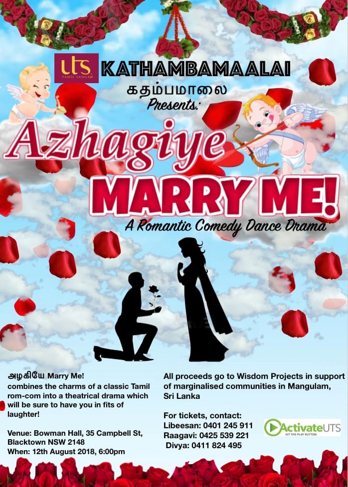 It is my pleasure to announce that our Sangam is bringing out our annual charity show in January, KATHAMBAMAALAI – கதம்பமாலை 2018. Furthermore, Kathambamalaai will be showcased as a theatrical production, ‘அழகியே Marry Me!’ – a romantic comedy DANCE-DRAMA (Please see event poster in the attachment). This show will be a night of dance, drama and music performed by local talents and Sydney youths.