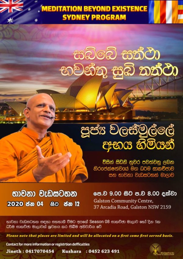 පූජ්ය වලස්මුල්ලේ අභය හිමියන් විසින් පවත්වනු ලබන ශ්රී සද්ධර්ම දේශනාව හා ආර්ය භාවනා වැඩසටහන – 2020 Sydney programme