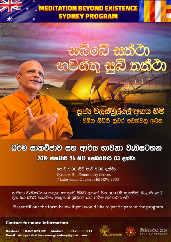 Meditation Beyond Existence Sydney Program Last updated: January 2, 2019 5:13 am By eLanka adminByeLanka admin Share 0 Min Read SHARE පූජ්ය වලස්මුල්ලේ අභය හිමියන් විසින් පවත ්වනු ලබන ශ්රී සද්ධර්ම දේශනාව හා ආර්ය භාවනා ව ැඩසටහන At Quakers Hill Community Center, 7Lalor Road, Quakers Hill , NSW 2763 Share This Article Email Copy Link Print Previous Article The Feast of the Mother of God – 1st January Next Article Biggest Family event in Summer Leave a Comment Leave a ReplyYou must be logged in to post a comment. FacebookLikeYoutubeSubscribeLinkedInFollow Most Read “A PICTURE SPEAKS A 1000 WORDS” – By Des Kelly “TREES OF SRI LANKA” – By Des Kelly A Life Hack for when we’re Burnt Out & Broken Down – By Uma Panch Narration of the History of our Proud Ancestral (Orang Jawa) Heritage. by Noor R. Rahim eLanka Marriage Proposals Noel News Noel News- By Noel Whittaker EILEEN MARY SIBELLE DE SILVA (nee DISSANAYAKE) – 29 September 1922 – 6 April 2018 – A Woman of Value an Appreciation written by Mohini Gunasekera K.K.S. Cement Factory Dr.Harold Gunatillake’s 90th Birthday party - Advertisement -