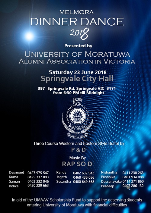 MELMORA DINNER DANCE 2018 – Presented by University of Moratuwa Alumni Association in Victoria ( 23 June 2018 – Melbourne Event) Last updated: April 29, 2018 10:46 am By eLanka adminByeLanka admin Share 0 Min Read SHARE MELMORA DINNER DANCE 2018 – Presented by University of Moratuwa Alumni Association in Victoria ( 23 June 2018 – Melbourne Event) Share This Article Email Copy Link Print Previous Article Old Anandians Association of Victoria – Maroons Night 2018 (19th May 2018 – Melbourne Event) Next Article Old Antonian Social Club – OASC function – Curry Nite – Friday 25th May (Melbourne Event) Leave a Comment Leave a ReplyYou must be logged in to post a comment. FacebookLikeYoutubeSubscribeLinkedInFollow Most Read “A PICTURE SPEAKS A 1000 WORDS” – By Des Kelly “TREES OF SRI LANKA” – By Des Kelly A Life Hack for when we’re Burnt Out & Broken Down – By Uma Panch Narration of the History of our Proud Ancestral (Orang Jawa) Heritage. by Noor R. Rahim eLanka Marriage Proposals Noel News Noel News- By Noel Whittaker EILEEN MARY SIBELLE DE SILVA (nee DISSANAYAKE) – 29 September 1922 – 6 April 2018 – A Woman of Value an Appreciation written by Mohini Gunasekera K.K.S. Cement Factory Dr.Harold Gunatillake’s 90th Birthday party - Advertisement -