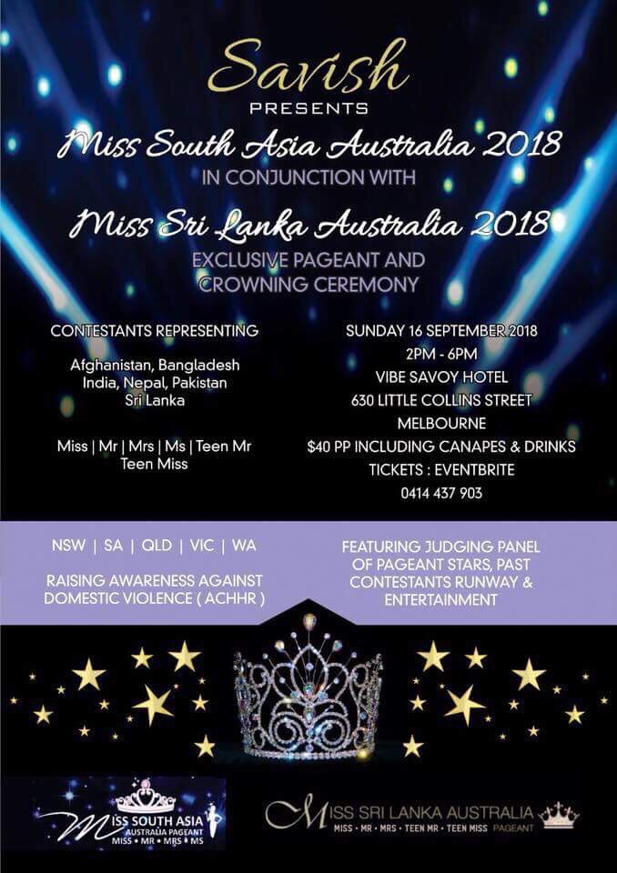 MISS SOUTH ASIA AUSTRALIA2018 Last updated: September 6, 2018 3:48 am By eLanka adminByeLanka admin Share 0 Min Read SHARE MISS SOUTH ASIA AUSTRALIA2018 SUNDAY 16 SEPTEMBER 2018 2PM-6PM VIBE SAVOY HOTEL 630 LITTLE COLINS STREET MELBOURNE CONTACT: 0414 437 903 Share This Article Email Copy Link Print Previous Article DHAMMA SERMONS Next Article Belvoir will transform Sydney Town Hall for its biggest show ever Leave a Comment Leave a ReplyYou must be logged in to post a comment. FacebookLikeYoutubeSubscribeLinkedInFollow Most Read “A PICTURE SPEAKS A 1000 WORDS” – By Des Kelly “TREES OF SRI LANKA” – By Des Kelly A Life Hack for when we’re Burnt Out & Broken Down – By Uma Panch Narration of the History of our Proud Ancestral (Orang Jawa) Heritage. by Noor R. Rahim eLanka Marriage Proposals Noel News Noel News- By Noel Whittaker EILEEN MARY SIBELLE DE SILVA (nee DISSANAYAKE) – 29 September 1922 – 6 April 2018 – A Woman of Value an Appreciation written by Mohini Gunasekera K.K.S. Cement Factory Dr.Harold Gunatillake’s 90th Birthday party - Advertisement -