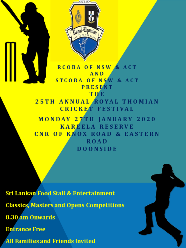 Annual Royal – Thomian Cricket festival is scheduled for the 27th of January 2020. There are 3 games played between the members of the two school Associations. Three categories are: