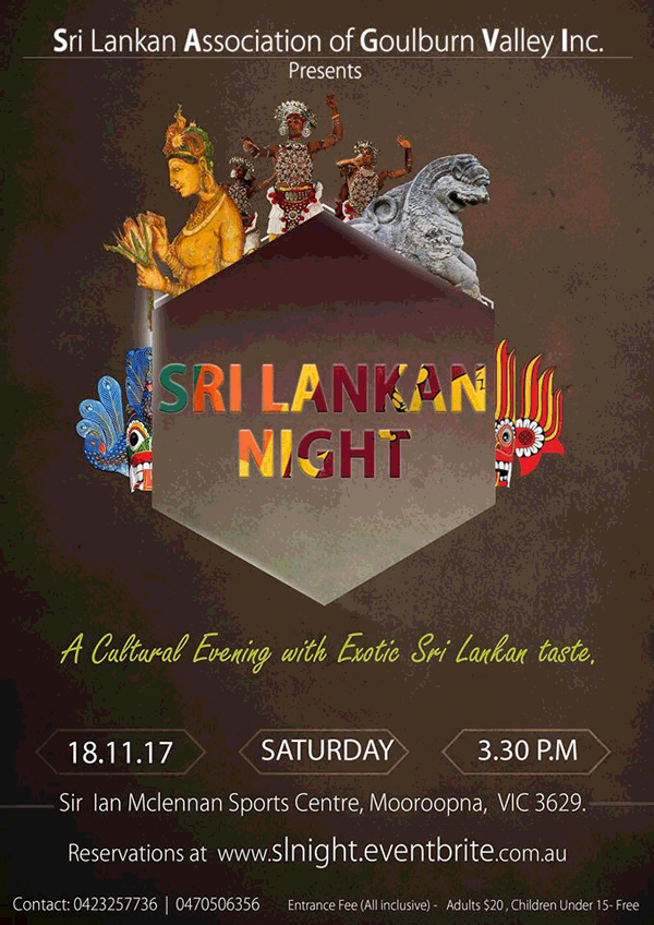 Sri Lankan Association of Goulburn Valley is organizing a Sri Lankan Cultural Evening with the objective of promoting the rich culture of Sri Lanka and to create harmony among different communities in our region. The evening will showcase Sri Lankan dancing, music and a variety of cultural events followed by a traditional Sri Lankan Dinner.
