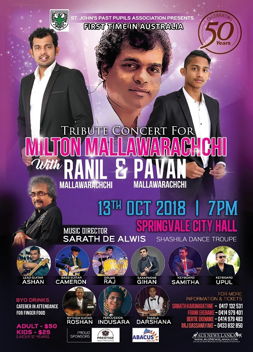 TRIBUTE CONCERT FOR MILTON MALLAWRACHCHI Last updated: September 28, 2018 5:19 am By eLanka adminByeLanka admin Share 0 Min Read SHARE TRIBUTE CONCERT FOR MILTON MALLAWRACHCHI 13th October 2018 7.00pm Springvale city hall,97 – 405 Springvale Road, Springvale C0ntact: berte ekenaika: 0414 979 483 Share This Article Email Copy Link Print Previous Article NASENA GEE Next Article FAMILIAN NIGHT 2018 Leave a Comment Leave a ReplyYou must be logged in to post a comment. FacebookLikeYoutubeSubscribeLinkedInFollow Most Read “A PICTURE SPEAKS A 1000 WORDS” – By Des Kelly “TREES OF SRI LANKA” – By Des Kelly A Life Hack for when we’re Burnt Out & Broken Down – By Uma Panch Narration of the History of our Proud Ancestral (Orang Jawa) Heritage. by Noor R. Rahim eLanka Marriage Proposals Noel News Noel News- By Noel Whittaker EILEEN MARY SIBELLE DE SILVA (nee DISSANAYAKE) – 29 September 1922 – 6 April 2018 – A Woman of Value an Appreciation written by Mohini Gunasekera K.K.S. Cement Factory Dr.Harold Gunatillake’s 90th Birthday party - Advertisement -