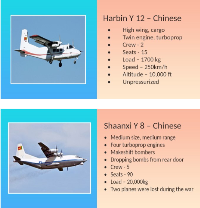 This was a Chinese built small military transport aircraft. The cockpit could accommodate only two, the pilot and the co-pilot. It had the capability of carrying 15 passengers or 15 paratroopers. The paratrooper seats were on the sides with seat belts and these seats were used on occasions. However, there were no paratroopers during the flight to Palaly. There were instances when the number of passengers exceeded 15 and they were accommodated in the cabin without seats. The seat was the floor of the aircraft. The aircraft carried everything necessary for the troops in addition to arms and ammunition and was cruising at a speed of 250 km/h carrying a maximum load of 1700 kg. Being unpressurized, the maximum altitude of flying was limited to 10,000 ft and the cabin was noisy, hot and vibrating. We also transported patients on stretchers lying on the floor and up to 5 patients could be accommodated at any one time. That was on the return trip to Colombo.