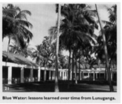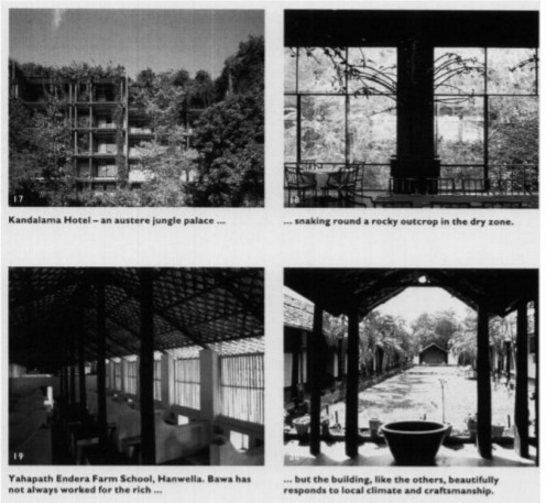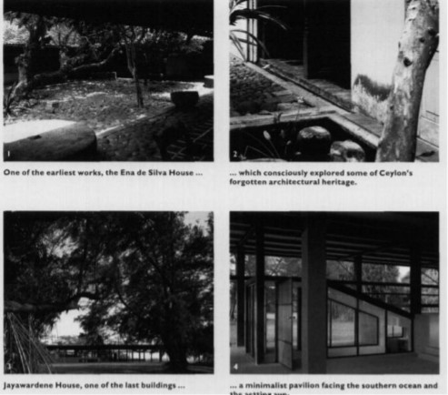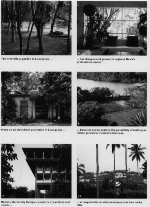 The town house, in contrast, is an introspective assemblage of courtyards, verandahs and loggias, created by knocking together four tiny bungalows and adding a white entry tower that peers like a periscope across neighbouring rooftops towards the distant ocean. It is a haven of peace, an infinite garden of the mind, locked away within a busy and increasingly hostile city. Throughout its long and colourful history Sri Lanka has been subjected to strong outside influences from its Indian neighbours, from Arab traders and from European colonists, and it has always succeeded in translating these elements into something new but intrinsically Sri Lankan. Bawa has continued this tradition. His architecture is a subtle blend of modernity and tradition, East and West, formal and picturesque; he has broken down the artificial segregation of inside and outside, building and landscape; he has drawn on tradition to create an architecture that is fitting to its place, and he has also used his vast knowledge of the modern w orld to create an architecture that is of its time.