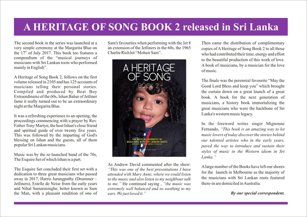Articles A Heritage of Song Book 2 released in Sri Lanka Last updated: August 18, 2017 9:19 am By admin Share 0 Min Read SHARE A Heritage of Song Book 2 released in Sri Lanka Please click here to view a larger version of this article TAGGED:A Heritage of Song Book 2 released in Sri Lanka Share This Article Email Copy Link Print Previous Article “SIGIRIYA” by Desmond Kelly ‘the Star of eLanka’ Next Article Hopper lunch by the Old Josephians FacebookLikeYoutubeSubscribeLinkedInFollow Most Read “A PICTURE SPEAKS A 1000 WORDS” – By Des Kelly “TREES OF SRI LANKA” – By Des Kelly A Life Hack for when we’re Burnt Out & Broken Down – By Uma Panch Narration of the History of our Proud Ancestral (Orang Jawa) Heritage. by Noor R. Rahim eLanka Marriage Proposals Noel News Noel News- By Noel Whittaker EILEEN MARY SIBELLE DE SILVA (nee DISSANAYAKE) – 29 September 1922 – 6 April 2018 – A Woman of Value an Appreciation written by Mohini Gunasekera K.K.S. Cement Factory Dr.Harold Gunatillake’s 90th Birthday party - Advertisement -