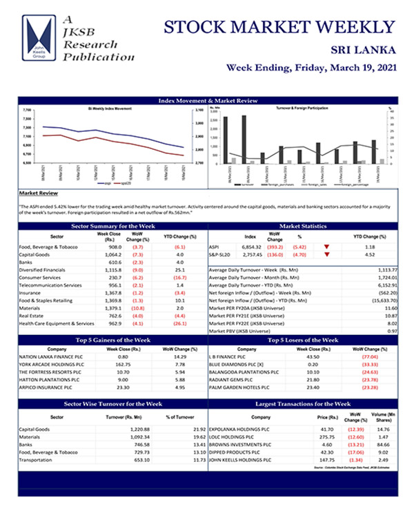 John Keells Stock Brokers (JKSB) – Sri Lanka – STOCK MARKET WEEKLY – 19-03-2021