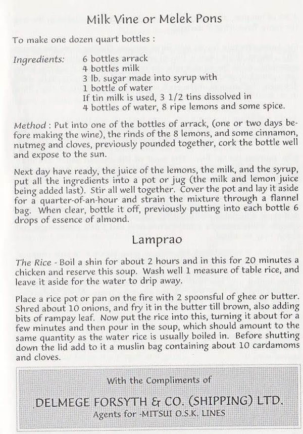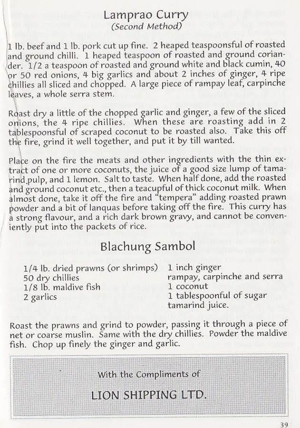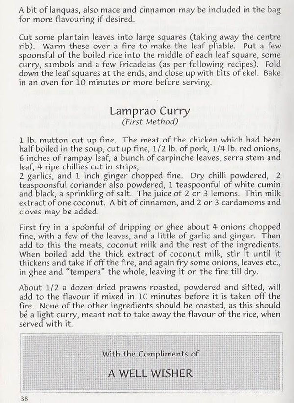 I am forwarding a scanned extract from the souvenir of the lamprais recipe, which covers pages 37 to 40. The inclusion of pages 36 and 41 was unavoidable in the scanning process and are not relevant to that recipe. Please note that this is the recipe of the “Huis-vrouw of 1770” and not my mother’s!