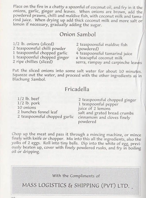 I recall my mother mentioning that the lamprai curry should comprise five meats, i.e. chicken, pork, beef, mutton or lamb and liver. However, the “Old Dutch Recipe” offers two options. The first – mutton, pork and chicken; the second – just beef and pork. My sister also remembers the five meats recipe my mother used, but says that my mother’s written recipe provides for just three meats. Perhaps, she improvised, as these special little touches were passed on from mother to daughter and were generally not recorded in writing, just as my sister makes her lamprais with five meats. Also, the “Old Dutch Recipe” mentions, apart from the curry, only the “Blachung” sambol, the onion [seeni] sambol and the fricadellas, which are, in fact, what we refer to as ball cutlets made of compressed beef, or a combination of beef and pork – never fish! This is because these items did not spoil easily, as there was no refrigeration then. Now, one may use one’s discretion in including brinjal pahi and a dry ash plantain preparation. Usually, each lamprai has just a large cup of rice, with the accompaniments, which really is just right, as it does not make you feel too full. However, Sri Lankans tend to need more than that to fill their tummies and the tendency is to include more rice these days.
