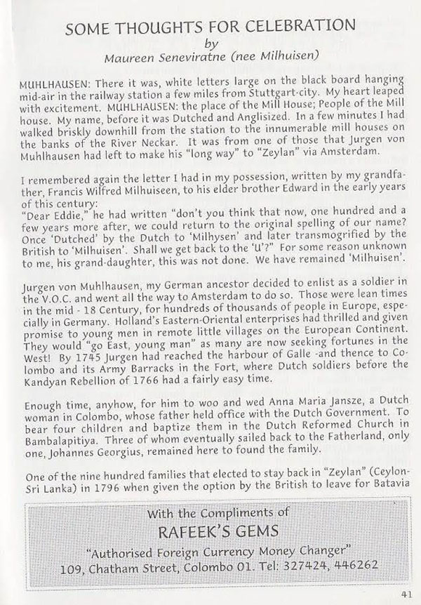 As you are aware, in 1998, the Dutch Burgher Union commemorated its 90th Anniversary, with the main event of the celebration taking the form of a grand public Dinner-Dance, which was, for the first time, held at a venue [a 5-Star Hotel] other than the DBU’s own hall at Thunmulla. One of the features for that evening was the production of a Souvenir booklet to be handed to everyone who attended. As Chairman of the Organizing Committee, I was determined that it should take the form of a valued keep-sake, to be cherished, rather than thrown away following the event, and that, I am happy to state, was achieved, as many who attended the event have preserved their copies, notwithstanding the lapse of 22 years.