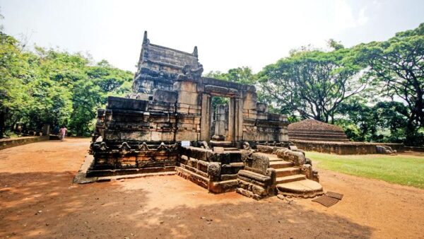 The Chola reigned over ancient Sri Lanka for three generations. Stone temples in Dravidian design proliferated in Polonnaruwa during this period. Artists emulated structures from solid brick mass to construct the finest monastic complexes. They embellished the façades and stone columns with shaivite and vaishnavite details. Just as any South Indian shrine, you could see Hindu motifs and deities such as Ganesh, Lakshmi and Kuvera adorning Nalanda Gedige’s image house. The image shrine houses a standing Buddha, a statue of Ganesh and a Bodhisattva figure.