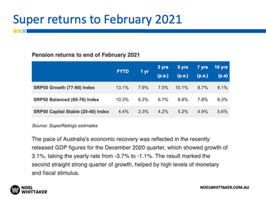 The latest returns for superannuation have just been released and they are shown below. As you can see, the returns for each period have been extremely good, but Growth is little bit in front of Balanced, and they are both way ahead of Capital Stable.