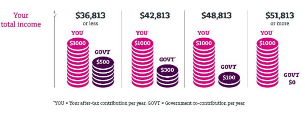If your income (i.e. assessable income, reportable fringe benefits and reportable employer super contributions) is less than $54,837 and at least 10% of this income is derived from employment activities (including self-employment), you may be entitled to the government super co-contribution of up to $500 if you make a personal non-concessional contribution to super. The maximum co-contribution of $500 will apply where income is $39,837 or less and you make a personal after tax contribution of at least $1,000.