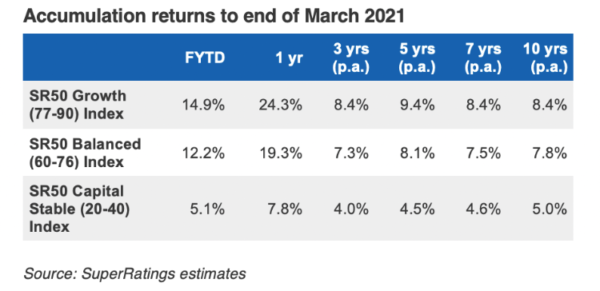 According to SuperRatings data, the median balanced option rose an estimated 2.0% in March, while the median growth option rose an estimated 2.4% and the median capital stable option rose an estimated 0.9%. Over the 2020-21 financial year to date, the median balanced option returned 12.2%, reflecting the strength and speed of the post-pandemic recovery, which extended through to the end of the March quarter.