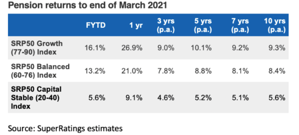 Pension returns were also positive in March. The median balanced pension option returned an estimated 2.1% over the month and 13.2% over the financial year to date. The median pension growth option returned an estimated 2.5% and the median capital stable option gained an estimated 1.0% through the month.