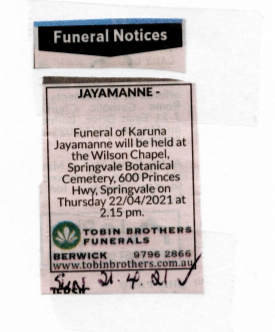 Articles Obituary notices – April 2021 Last updated: May 2, 2021 5:53 pm By eLanka adminByeLanka admin Share 0 Min Read SHARE Obituary notices – April 2021 TAGGED:Obituary notices – April 2021 Share This Article Email Copy Link Print Previous Article eLanka Newsletter –02 May 2021 – 1st edition – Sri Lankans in Australia Next Article Human Elephant Conflict-Sri Lanka – by Oscar E V Fernando FacebookLikeYoutubeSubscribeLinkedInFollow Most Read “A PICTURE SPEAKS A 1000 WORDS” – By Des Kelly “TREES OF SRI LANKA” – By Des Kelly A Life Hack for when we’re Burnt Out & Broken Down – By Uma Panch Narration of the History of our Proud Ancestral (Orang Jawa) Heritage. by Noor R. Rahim eLanka Marriage Proposals Noel News Noel News- By Noel Whittaker EILEEN MARY SIBELLE DE SILVA (nee DISSANAYAKE) – 29 September 1922 – 6 April 2018 – A Woman of Value an Appreciation written by Mohini Gunasekera K.K.S. Cement Factory Dr.Harold Gunatillake’s 90th Birthday party - Advertisement -