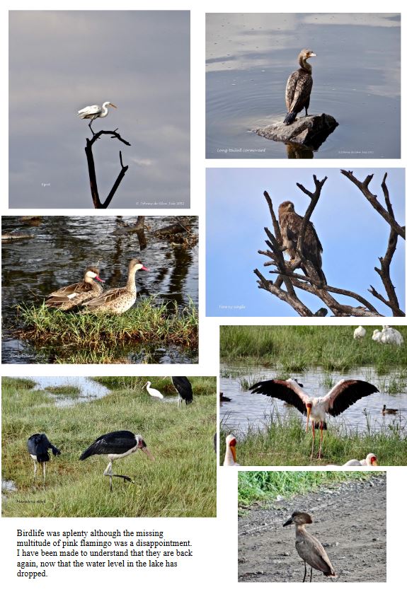 The flamingo had ceased to visit after the lake was recently flooded causing the depletion of the blue-green algae, their favourite food, due to the dilution of the soda in the lake. The National Park is the home of the Rothschild’s giraffe and is a sanctuary for the White Rhino. Extensive driving through the lush forest was required to spot the animals. Unfortunately, we encountered heavy rain on one drive that put paid to good animal photography.