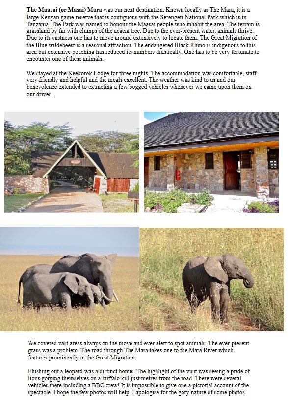 Five years had gone by and we got the urge to visit Africa again. On this occasion we concentrated on Kenya. There were two National Reserves that held our interest, Amboseli and The Maasai Mara. To make the safari worth our while we attached a visit to the Aberdare Ark, Lake Nakuru and Lake Naivasha.
