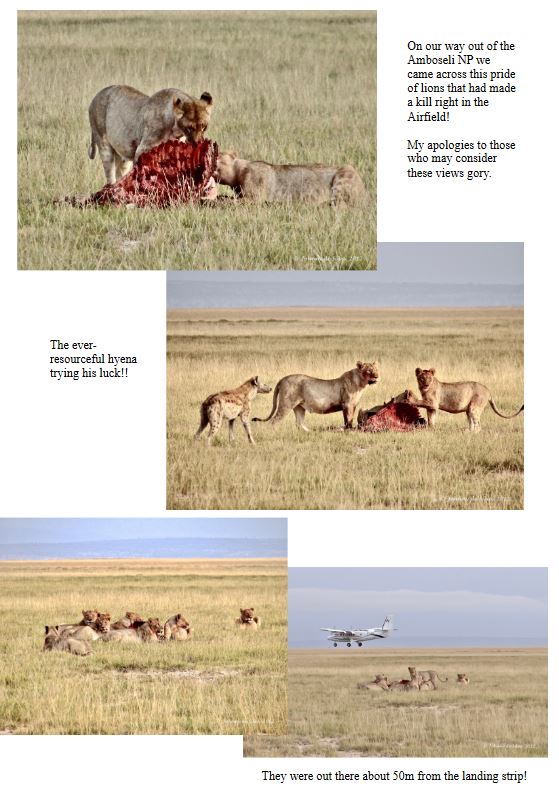 We also had a few serendipitous sightings. It was on our way out of the Reserve that we came upon a pride of lion, within the airfield, guarding a kill. Although we had far to travel to our next destination, we took the opportunity to watch them feasting. I was fortunate to record on video an aeroplane landing with the lions in the foreground. Here then are a collection of some photographs. Apart from the photos there is a fair collection of video clips to bring back memories.