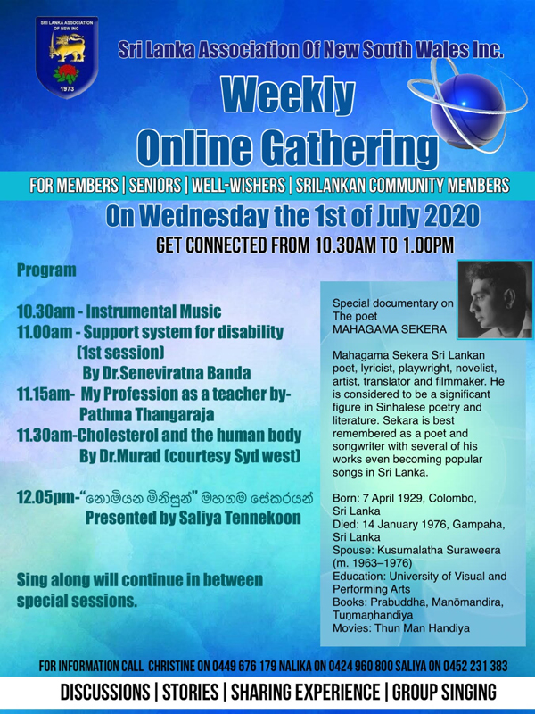 Sri Lanka Association of NSW – Weekly Online Gathering starting on 1 July 2020