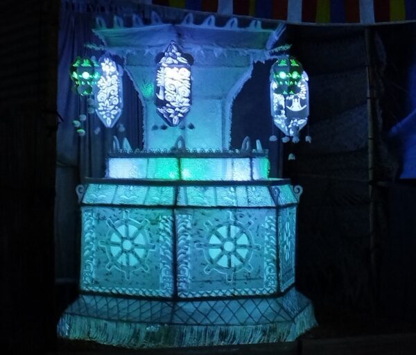 Thoran, or pandals, are large, illuminated structures that depict scenes from the Jataka tales, stories about the previous lives of the Buddha. These pandals are usually erected at significant public places and are a collaborative effort by community members. Each pandal is a work of art, often featuring intricate paintings and lighting effects that draw large crowds during the Vesak celebrations.