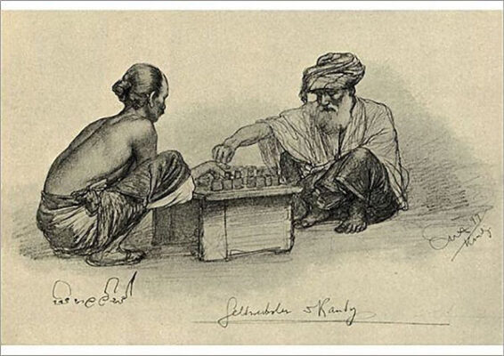 An illustration of an Afghan moneylender playing with a native of Ceylon by German artist Christian Wilhelm Allers. ca. 1899