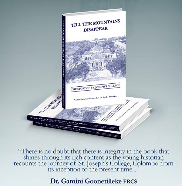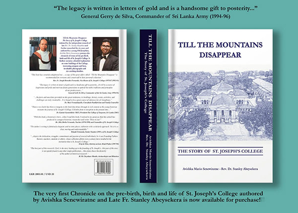 The first chronicle on the history of St. Joseph’s College, Colombo 10 titled, *Till the mountains disappear: The Story of St. Joseph’s College* initiated by the independent research of the late *Rev. Dr. Stanley Abeysekera* (the 10th Rector), and further researched for *six years* by the young Old Josephian, *Avishka Senewiratne* was launched on 19 January, 2021 in the presence of *His Lordship, Rt. Rev. Dr. Anton Ranjith, the Auxiliary Bishop of Colombo, Rev. Fr. Victor Silva, Rev. Fr. Sylvester Ranasinghe and Rev. Fr. Travis Gabriel* (former Rectors), *Rev. Fr. Chrispin Leo and Rev. Fr. Joseph Benedict Fernando* (former Vice Rectors), priests, past and present teachers, distinguished Old Boys from the 1950s to 2010s and many distinguished guests. A splendid review for this book was delivered by *General Gerry de Silva*, former Commander of the Sri Lanka Army, who was a student of the late Rev. Fr. Peter Pillai. The book contains the untiring efforts of Archbishop Bonjean in establishing St. Joseph’s College, the chronicle of events from 1896 to 2019, a special section on the buildings and architecture of the College, rare letters, extracts from memoirs and salient snippets. It also contains over 200 rare photographs and 13 finely sketched illustrations of historical events.