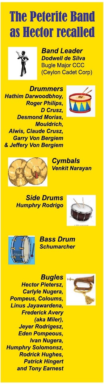 Hector claimed that the most memorable time of his life was at St. Peter’s but hastened to add that it was no holiday. His regular routine had started with boxing practice at 5.00 a.m. after which they were treated to a cup of ‘Oxo’ and raw carrots, band practice at 7.00 a.m., regular school at 8.45 a.m., band practice at 2.45 p.m. Some in the band, he said were athletes training under Mr. Van Twest the athletics coach while a few others were ruggerites training under Mr. Archibald Perera. Despite such a crowded schedule he said that they were dedicated to what had to be done and enjoyed doing what they did.