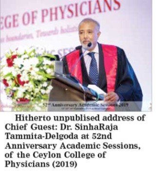 An institution, a learned society and a body of practitioners, the Ceylon College of Physicians stands at the apex of medical learning and practice in Sri Lanka. For over half a century, the College has fulfilled an integral role in medical education and the maintenance of professional standards. As an institution, it has played a valuable part in the building of our nation. As a scholar, a historian and a Sri Lankan, it is a privilege and an honour to address its 52nd assembly.