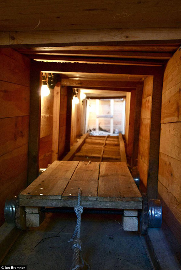 Tunnel vision: A tunnel reconstruction showing the trolley system, tried out, below, by Frank, 89