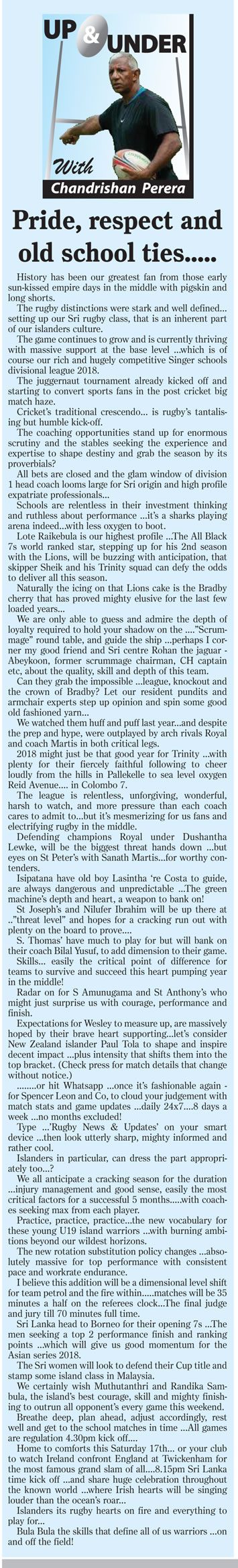 ArticlesHomeTrevine Rodrigo Up & Under with Chandrishan Perera – Thanks to Trevine Rodrigo (Melbourne) Last updated: March 17, 2018 1:52 pm By eLanka adminByeLanka admin Share 0 Min Read SHARE Up & Under with Chandrishan Perera – Thanks to Trevine Rodrigo (Melbourne) Share This Article Email Copy Link Print Previous Article Blow hot, blow cold Sri Lanka dumped from Nidahas Trophy – India and Bangladesh meet in Colombo final BY TREVINE RODRIGO IN MELBOURNE Next Article What is Diabetes? I am sure you all heard this before: by Dr Hector Perera – London FacebookLikeYoutubeSubscribeLinkedInFollow Most Read “A PICTURE SPEAKS A 1000 WORDS” – By Des Kelly “TREES OF SRI LANKA” – By Des Kelly A Life Hack for when we’re Burnt Out & Broken Down – By Uma Panch Narration of the History of our Proud Ancestral (Orang Jawa) Heritage. by Noor R. Rahim eLanka Marriage Proposals Noel News Noel News- By Noel Whittaker EILEEN MARY SIBELLE DE SILVA (nee DISSANAYAKE) – 29 September 1922 – 6 April 2018 – A Woman of Value an Appreciation written by Mohini Gunasekera K.K.S. Cement Factory Dr.Harold Gunatillake’s 90th Birthday party - Advertisement -