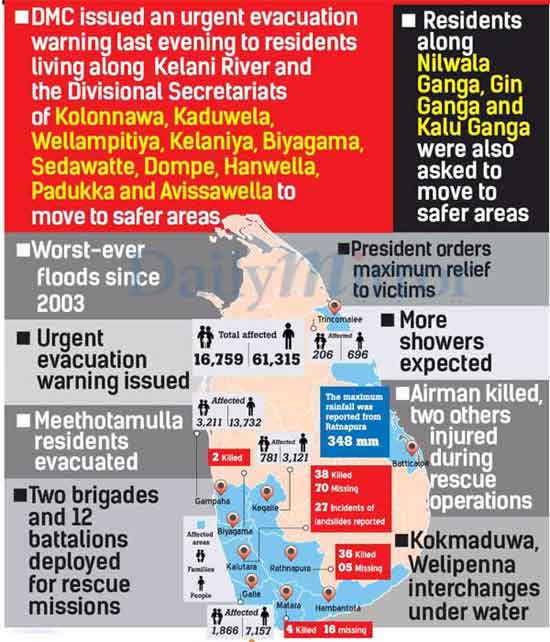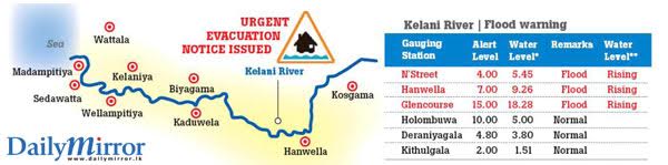The Disaster Management Center issued an urgent evacuation warning last evening instructing residents living along the Kelani River and within the Divisional Secretariats of Kollonnawa, Kaduwela, Wellampitiya, Kelaniya, Biyagama, Sedawatte, Dompe, Hanwella, Padukka and Avissawella to move to safer areas.