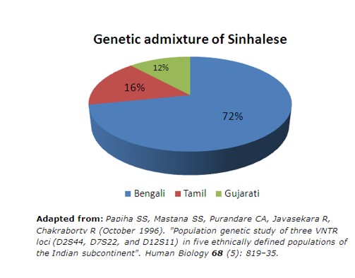 While there are many studies done on the genetic mix of the Sinhala race, the following perhaps is generally representative of historical mix and consistent with historical records of migrations into the island.